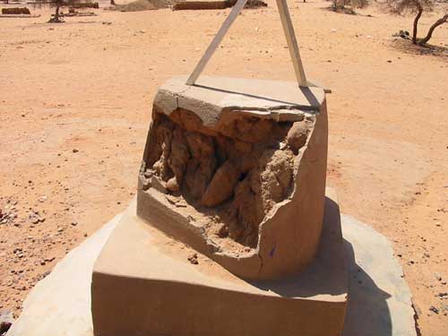 このメナカには、1975年、ラクダでサハラ砂漠横断を試み亡くなった上温湯隆(かみおんゆ たかし)氏の墓標モニュメントがあります。右端が彼の墓標ですが、半分崩れていました。左の2つはここで亡くなった白人のお墓です。一つはライオンに襲われたフランス人、真ん中はわかりませんでした。